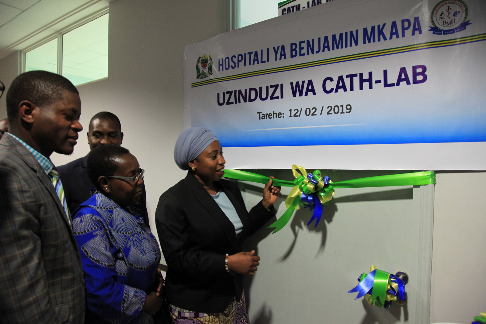 Waziri wa Afya, Maendeleo ya Jamii, Jinsia, Wazee na Watoto Mhe. Ummy Mwalimu (aliye mbele) akizindua rasmi maabara ya uchunguzi na tiba ya magonjwa ya moyo (Cathlab) katika Hospitali ya Benjamin Mkapa Jijini Dodoma walio kushoto ni Katibu Mkuu Wizara ya Afya Dkt. Zainab Chaula pamoja na Mkurugenzi Mtendaji Hospitali ya Benjamin Mkapa Dkt. Alphonce chandika.