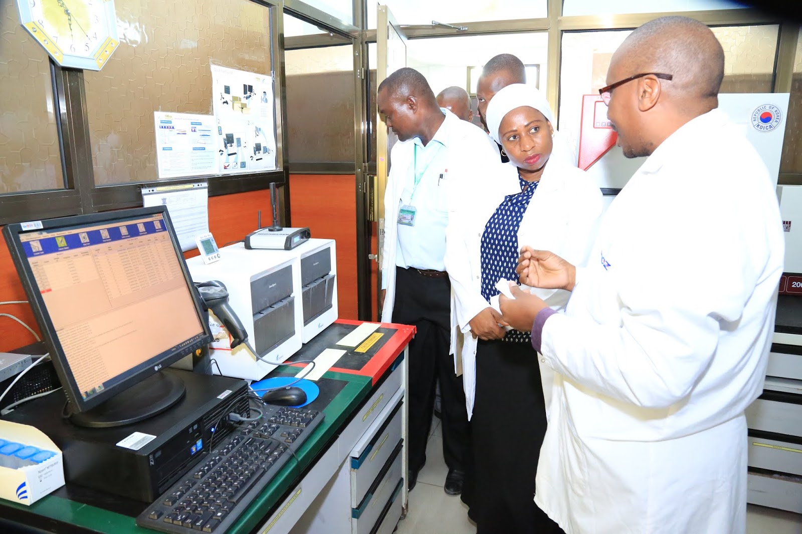 (wa kati kati) akipokea maelezo kutoka kwa mtaalam kuhusu uchugnguzi wa