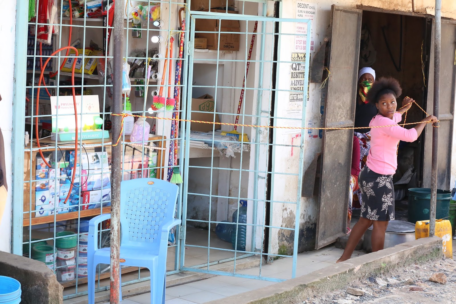 Mkazi wa Mbezi Mwisho Jijini dar es salaam aliyeweka uzio wa kamba kwenye duka lake kujitenganisha na mteja, inayosaidia kumzuia mteja kuingia dukani kabla ya kunawa mikono kwa sabuni na maji safi yanayotiririka na kuzuia mteja asikae karibu nae wakati anamhudumia, ikiwa ni muitikio chanya kutoka Wizara ya Afya wa kukaa mita moja au zaidi baina ya mtu mmoja na mwingine na kusafisha mikono kwa sabuni na maji safi yanayotiririka kabla ya kupata huduma yoyote ili kujikinga na maambukizi ya virusi vya Corona.