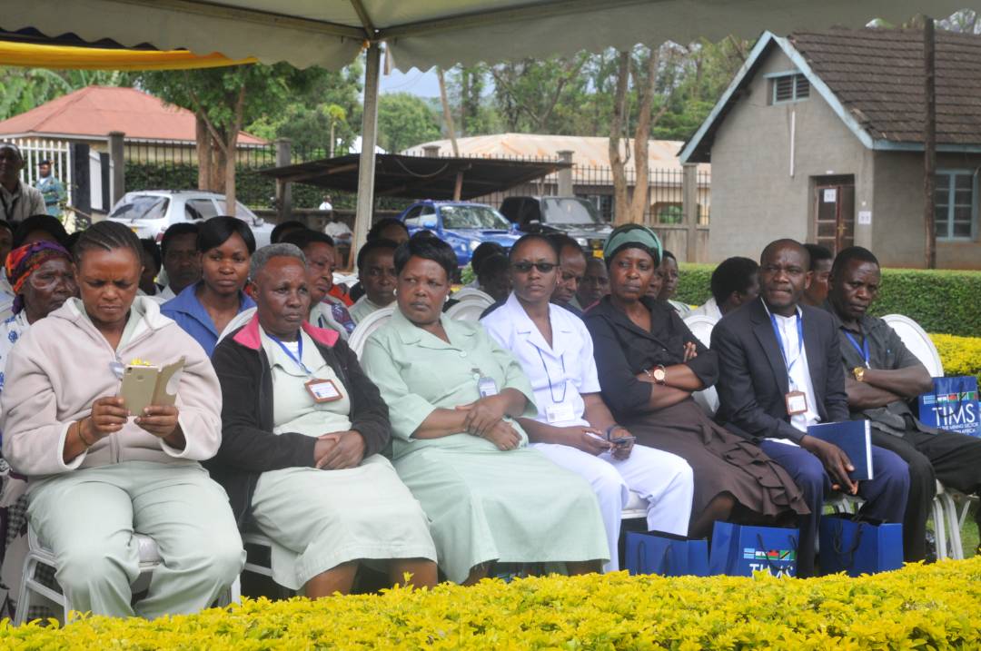 Baadhi ya watumishi wa Hospitali ya Kibong'oto wakimsikiliza Waziri Ummy Mwalimu(hayupo pichani)wakati akihutubi ambapo alisema kituo hicho ni miongoni mwa vituo 11 vilivyojengwa katika nchi 10 za SADC