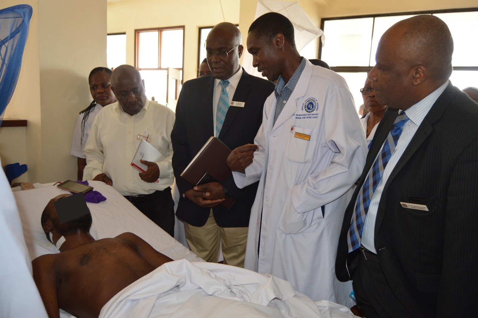 Katibu Mkuu wa Wizara ya Afya ,Maendeleo ya Jamii ,Jinsia , Wazee na Watoto Dkt Mpoki Ulisubisya akimjulia hali Mgonjwa aliyefanyiwa upasuaji Mkubwa wa Mgongo , kulia kwake ni Daktari bingwa wa Upasuaji wa Ubongo na Mgongo Dkt Nicephorus Rutabansibwa akitoa maelekezo  juu ya maendeleo ya mgonjwa huyo, wa mwisho ni Mganga mkuu wa Serikali Prof. Muhamad Kambi.