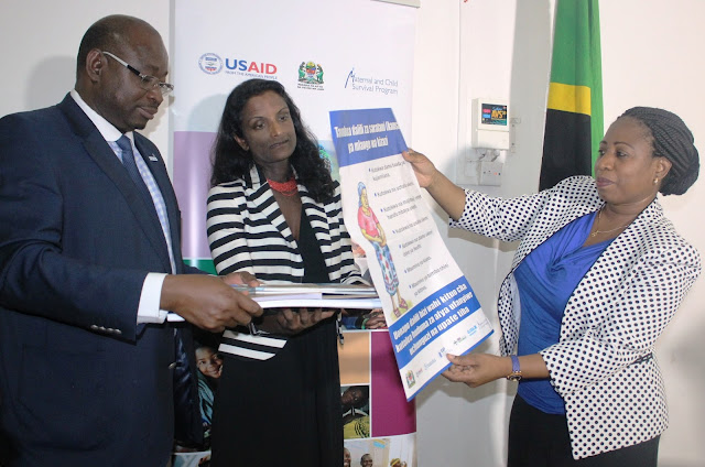 Waziri  Wa Afya,Maendeleo ya Jamii,Jinsia, Wazee na Watoto Mhe. Ummy Mwalimu kulia akipokea moja ya nyenzo za  kufundishia juu ya uchunguzi wa saratani ya kizazi kutoka kwa Mkurugenzi Mkazi wa Jhpiego nchini Tanzania Bw. Jeremia Zoungran kushoto wakati wa makabidhiano ya vifaa vya kuchunguza saratani ya kizazi leo jijini Dar es salaam katikati ni Afisa Afya kutoka USAID Bi. Ananth Thambinyga.