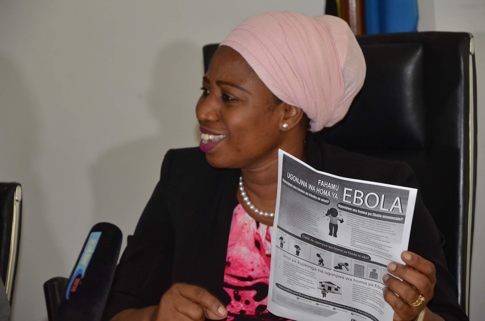 Waziri wa Afya, Maendeleo ya Jamii, Jinsia, Wazee na Watoto Mhe. Ummy Mwalimu akionesha bango lenye ujumbe kuhusu Ugonjwa wa homa ya Ebola uliojitokeza katika nchi ya jirani ya Jamhuri ya Demokrasia ya Kongo.