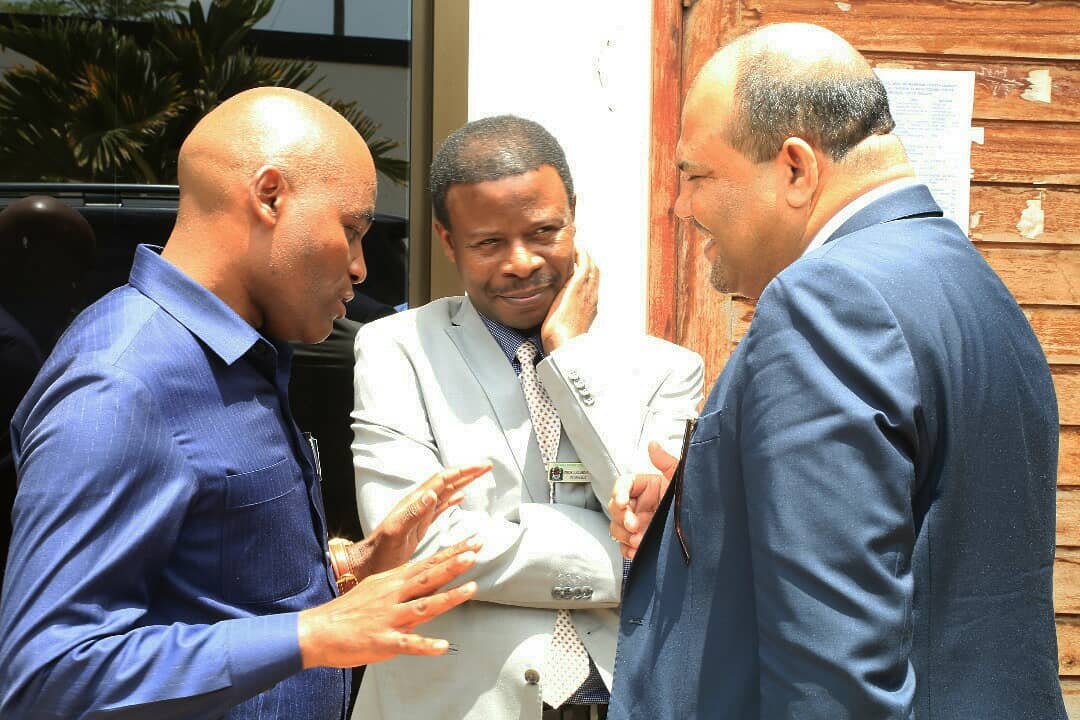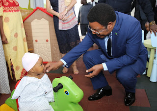 Waziri Mkuu, Mhe. Kassim Majaliwa wa (wa tatu kutoka kushoto) akiongozana na Waziri wa Afya, Maendeleo ya Jamii, Jinsia, Wazee na Watoto Mhe. Ummy Mwalimu (wa pili kushoto) na Waziri wa Nchi, Ofisi ya Waziri Mkuu, Uwekezaj Mhe. Angellah Kairuki (kushoto) kuelekea maabara za Mamlaka ya Chakula na Dawa (TFDA)