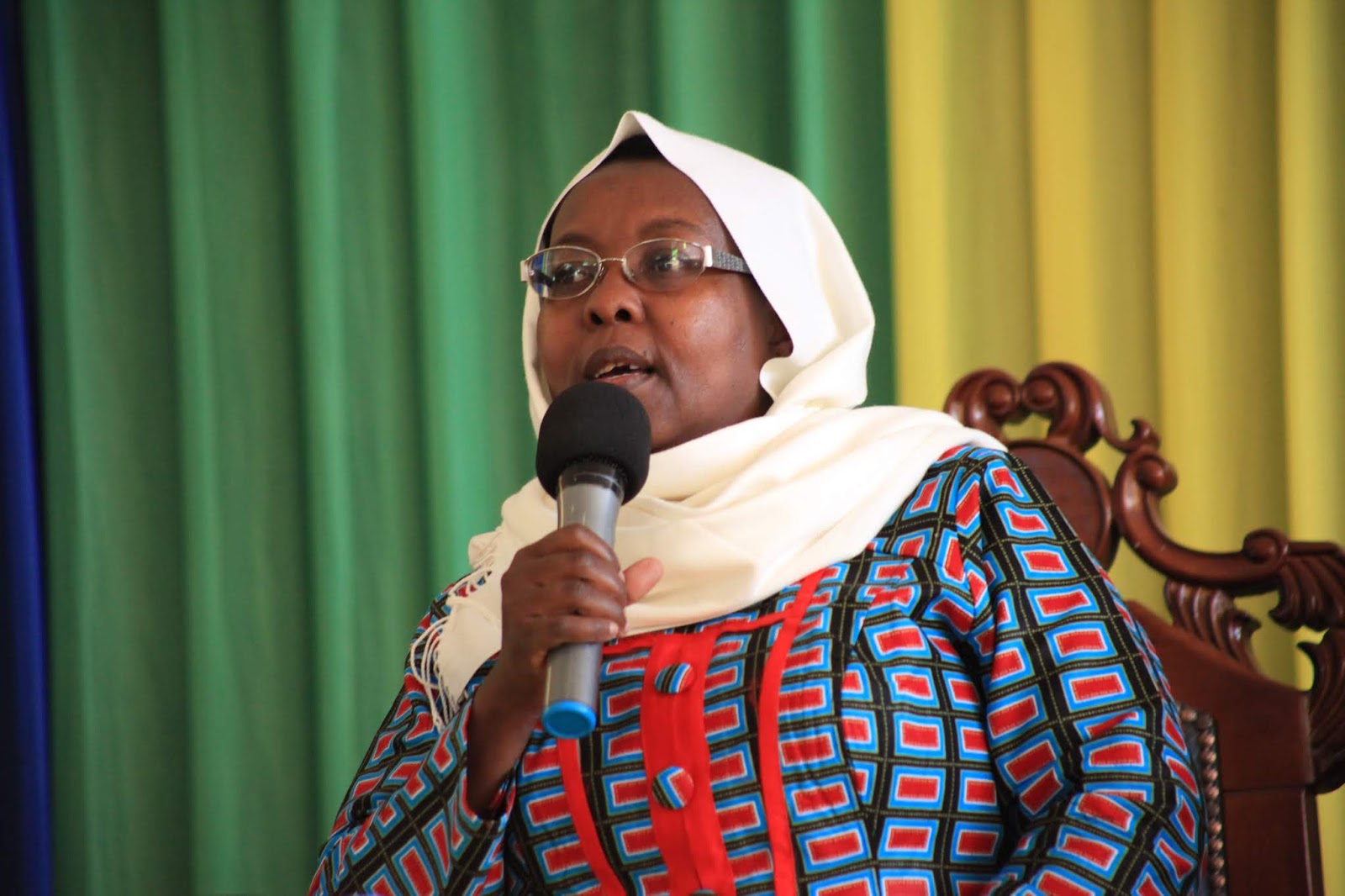 Waziri wa Afya, Maendeleo ya Jamii, Jinsia, Wazee na Watoto Mhe. Ummy Mwalimu akitoa taarifa ya Wizara ya utekelezaji mbele ya Rais wa Jamhuri ya Muungano wa Tanzania Mhe. Dkt. John Pombe Magufuli (hayupo kwenye picha) wakati wa uzinduzi rasmi wa miradi 7 yenye jumla ya shilingi Bilion 15 katika Hospitali ya Rufaa ya kanda ya ziwa Bugando.